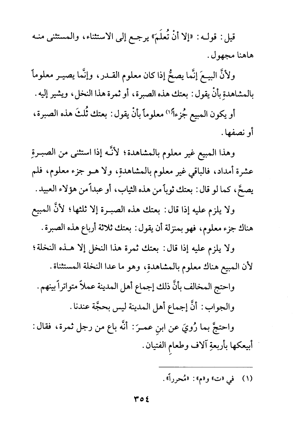 وهذا المبيع غير معلوم بالمشاهدة؛ لأنه إذا استثنى من الصبرة عشرة أمداد، فالباقي غير معلوم بالمشاهدة، ولا هو جزء معلوم، فلم يصح، كما لو قال: بعتك ثوبًا من هذه الثياب، أو عبدًا من هؤلاء العبيد.