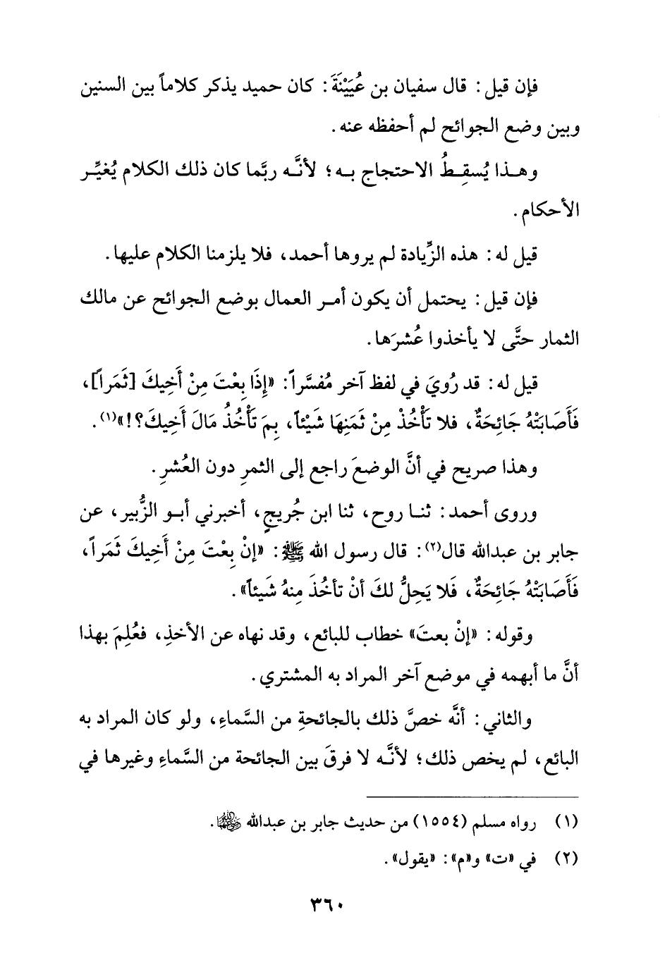 وروى أحمد: ثنا روح، ثنا ابن جريجٍ، أخبرني أبو الزبير، عن جابر بن عبد الله قال: قال رسول الله - صلى الله عليه وسلم -: (إن بعت من أخيك ثمرًا، فأصابته جائحة، فلا يحل لك أن تأخذ منه شيئًا).