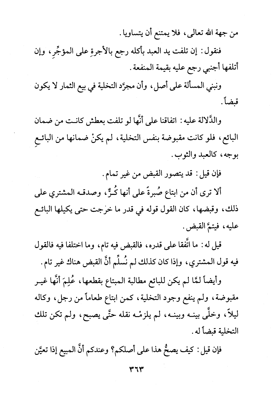 وأيضًا لما لم يكن للبائع مطالبة المبتاع بقطعها، علم أنها غير مقبوضة، ولم ينفع وجود التخلية، كمن ابتاع طعامًا من رجل، وكاله ليلًا، وخلى بينه وبينه، لم يلزمه نقله حتى يصبح، ولم تكن تلك التخلية قبضًا له.