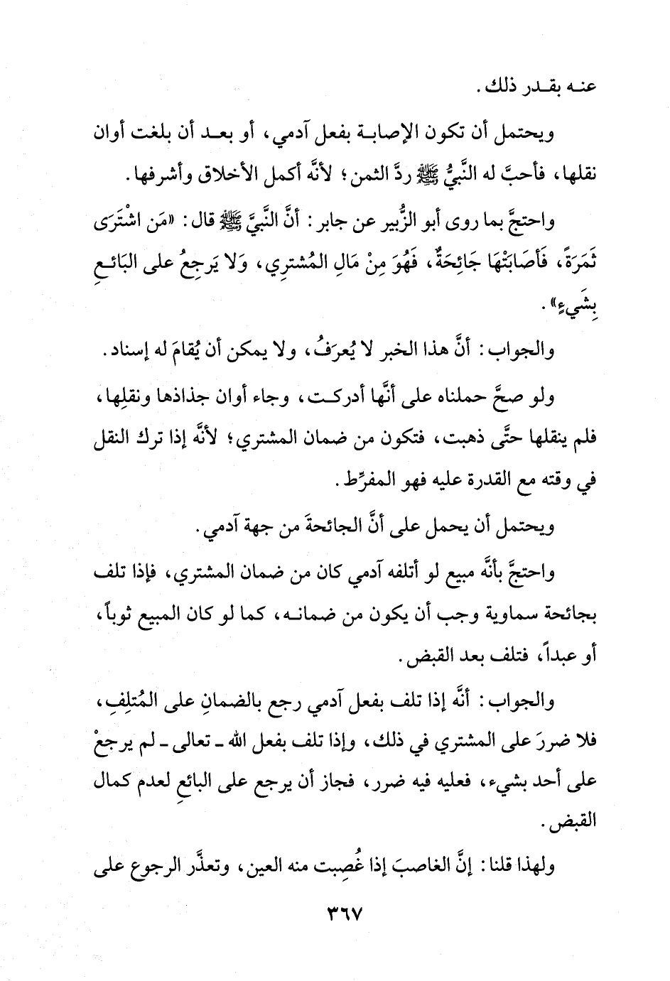 واحتج بأنه مبيع لو أتلفه آدمي كان من ضمان المشتري، فإذا تلف بجائحة سماوية وجب أن يكون من ضمانه، كما لو كان المبيع ثوبًا، أو عبدًا، فتلف بعد القبض.