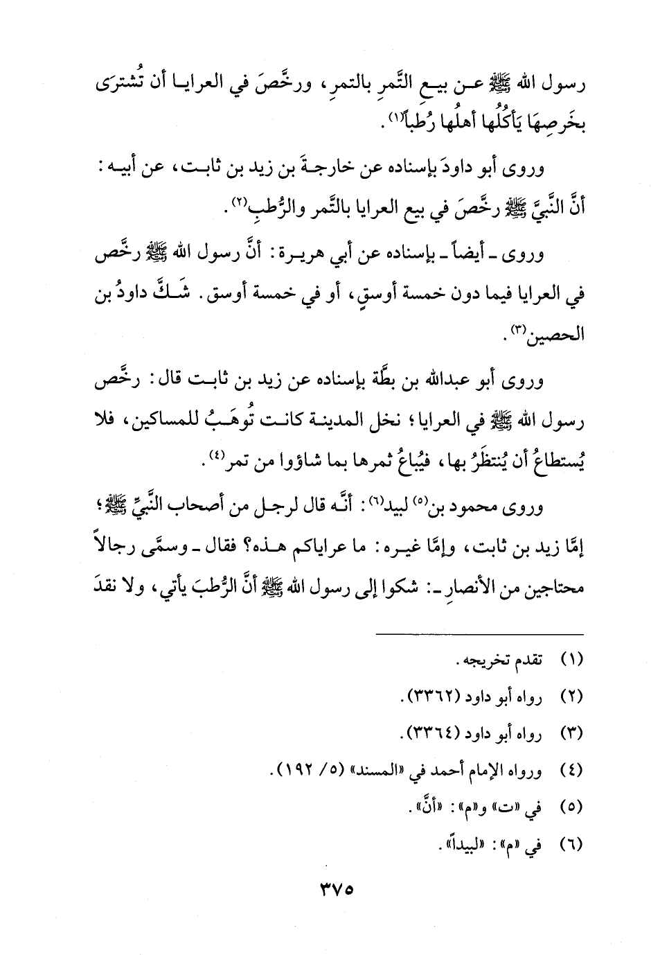 وروى أبو داود بإسناده عن خارجة بن زيد بن ثابت، عن أبيه: أن النبي - صلى الله عليه وسلم - رخص في بيع العرايا بالتمر والرطب.