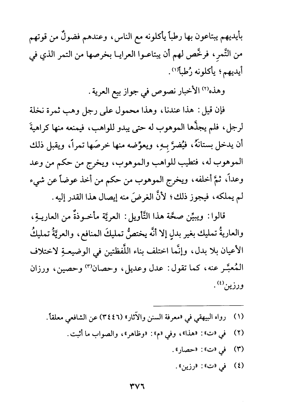 قالوا: ويبين صحة هذا التأويل: العرية مأخوذة من العارية، والعارية تمليك بغير بدلٍ إلا أنه يختص تمليك المنافع، والعرية تمليك الأعيان بلا بدل، وإنما اختلف بناء اللفظتين في الوضيعة لاختلاف المعبر عنه، كما تقول: عدل وعديل، وحصان وحصين، ورزان ورزين.