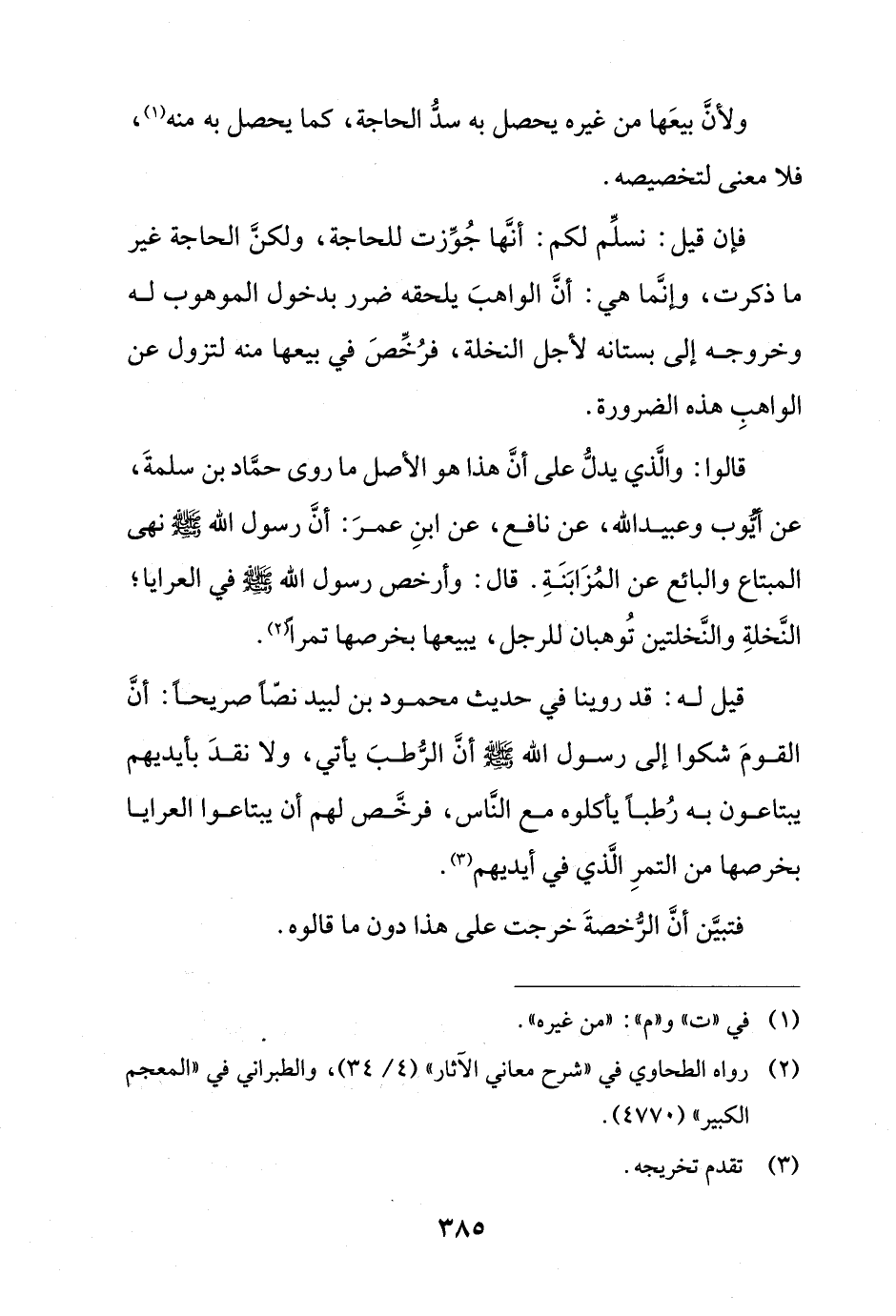 قالوا: والذي يدل على أن هذا هو الأصل ما روى حماد بن سلمة، عن أيوب وعبيد الله، عن نافع، عن ابن عمر: أن رسول الله - صلى الله عليه وسلم - نهى المبتاع والبائع عن المزابنة. قال: وأرخص رسول الله - صلى الله عليه وسلم - في العرايا؛ النخلة والنخلتين توهبان للرجل، يبيعها بخرصها تمرًا.
