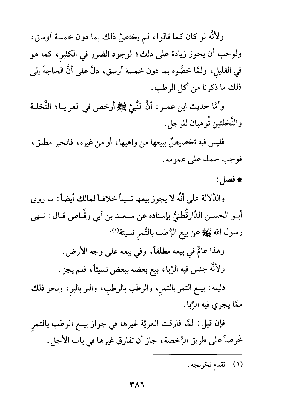 ولأنه لو كان كما قالوا، لم يختص ذلك بما دون خمسة أوسق، ولوجب أن يجوز زيادة على ذلك؛ لوجود الضرر في الكثير، كما هو في القليل، ولما خصوه بما دون خمسة أوسق، دل على أن الحاجة إلى ذلك ما ذكرنا من أكل الرطب.
