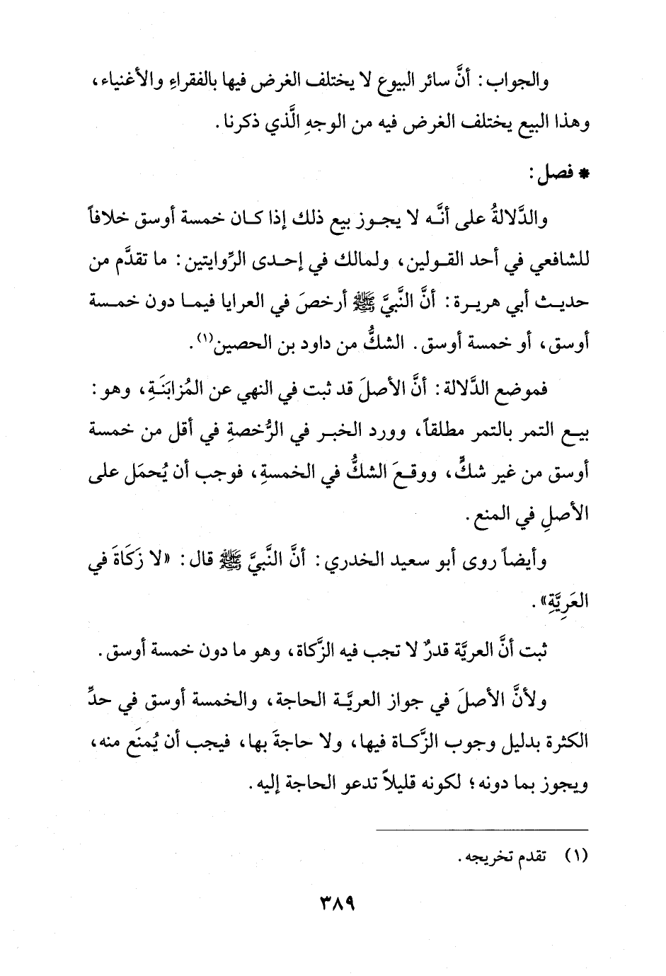 ولأن الأصل في جواز العرية الحاجة، والخمسة أوسق في حد الكثرة بدليل وجوب الزكاة فيها، ولا حاجة بها، فيجب أن يمنع منه، ويجوز بما دونه؛ لكونه قليلًا تدعو الحاجة إليه.