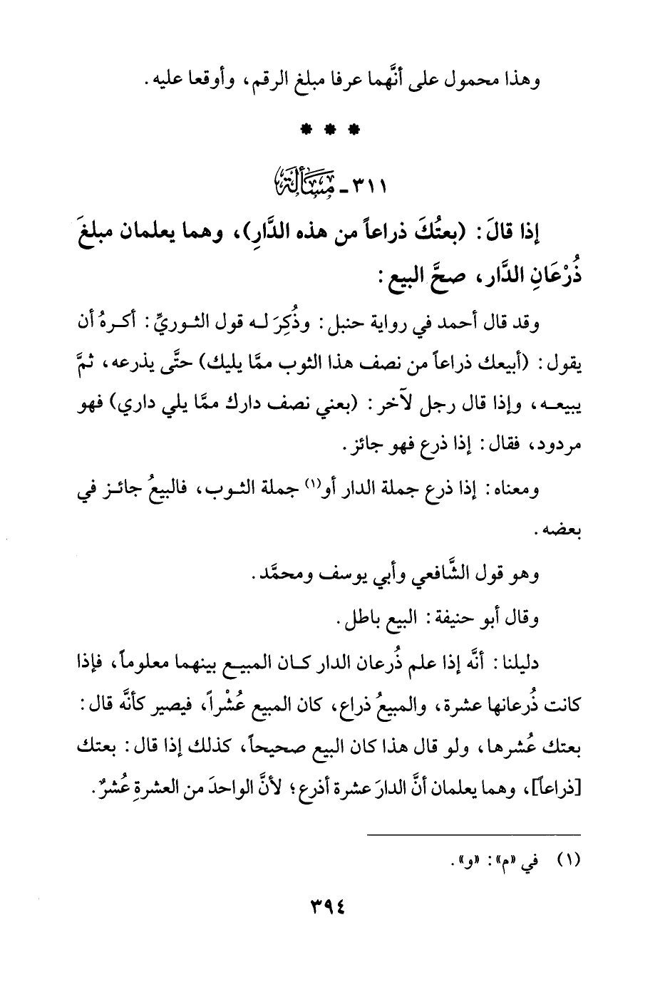 وقد قال أحمد في رواية حنبل: وذكر له قول الثوري: أكره أن يقول: (أبيعك ذراعًا من نصف هذا الثوب مما يليك) حتى يذرعه، ثم يبيعه، وإذا قال رجل لآخر: (بعني نصف دارك مما يلي داري) فهو مردود، فقال: إذا ذرع فهو جائز.