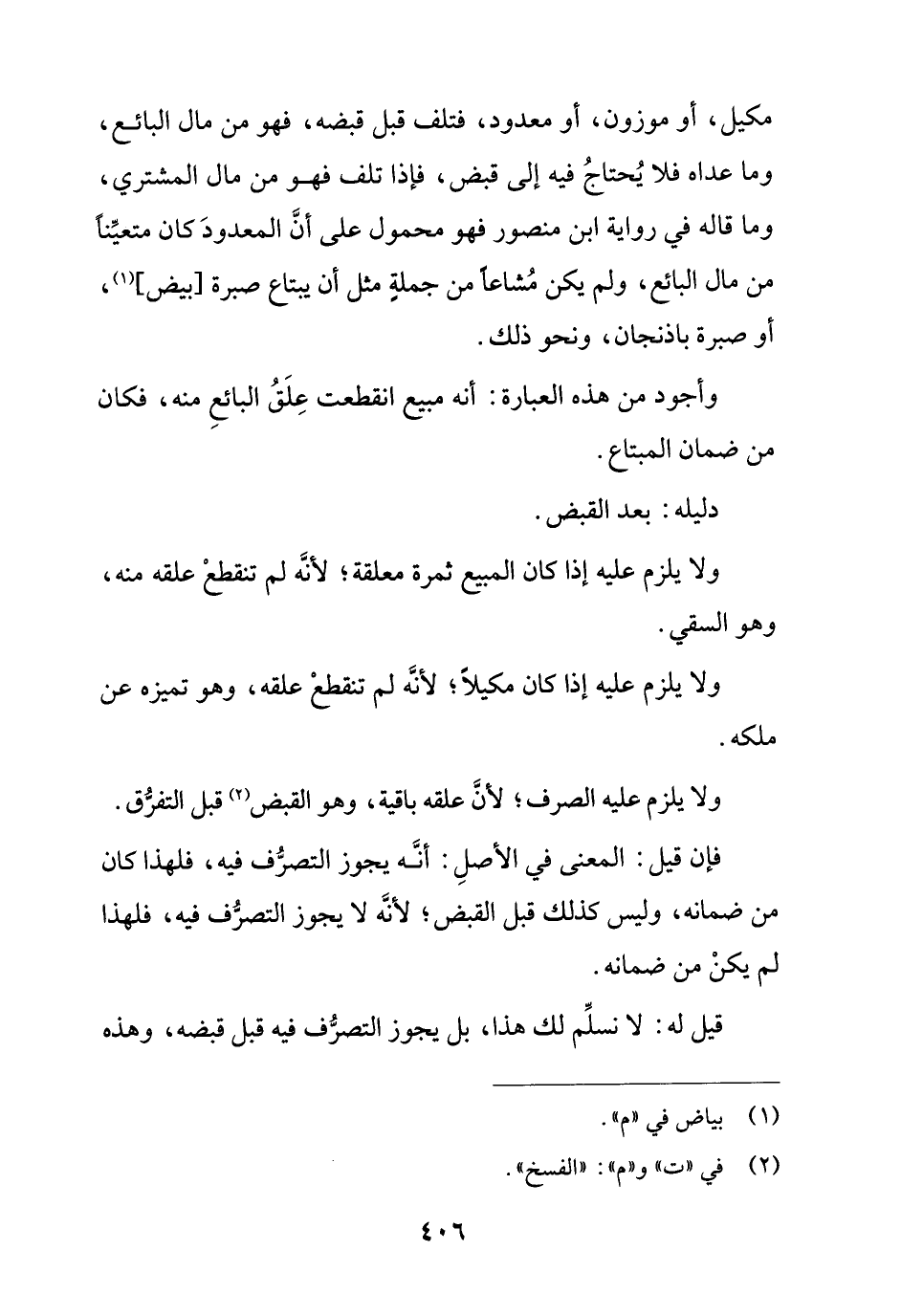 مكيل, أو موزون, أو معدود, فتلف قبل قبضه, فهو من مال البائع, وما عداه فلا يحتاج فيه إلى قبض, فإذا تلف فهو من مال المشتري, وما قاله في رواية ابن منصور فهو محمول على أن المعدود كان متعينًا من مال البائع, ولم يكن مشاعًا من جملة مثل أن يبتاع صبرة [بيض] , أو صبرة باذنجان, ونحو ذلك.