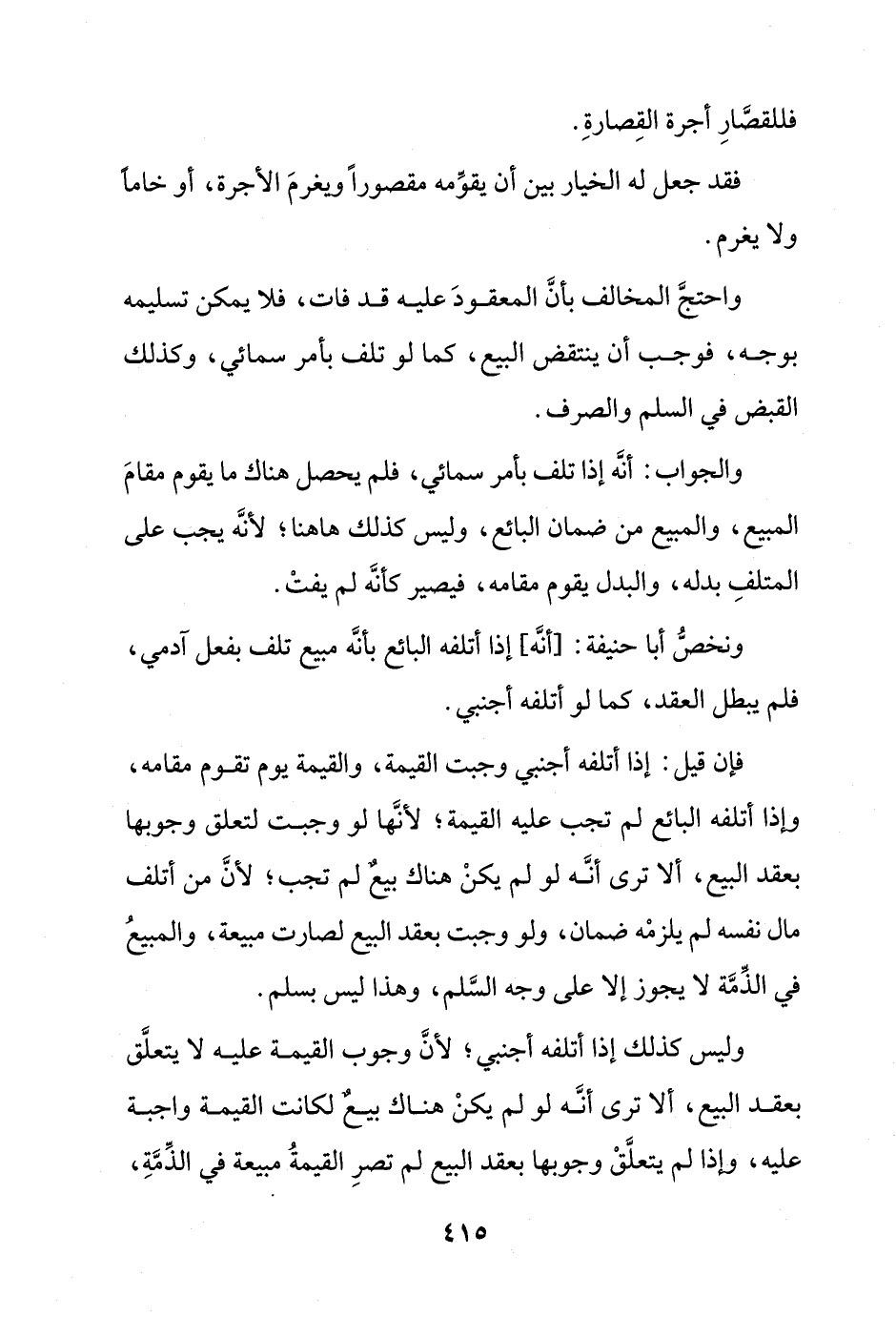 فإن قيل: إذا أتلفه أجنبي وجبت القيمة, والقيمة يوم تقوم مقامه, وإذا أتلفه البائع لم تجب عليه القيمة؛ لأنها لو وجبت لتعلق وجوبها بعقد البيع, ألا ترى أنه لو لم يكن هناك بيع لم تجب؛ لأن من أتلف مال نفسه لم يلزمه ضمان, ولو وجبت بعقد البيع لصارت مبيعة, والمبيع في الذمة لا يجوز إلا على وجه السلم, وهذا ليس بسلم.