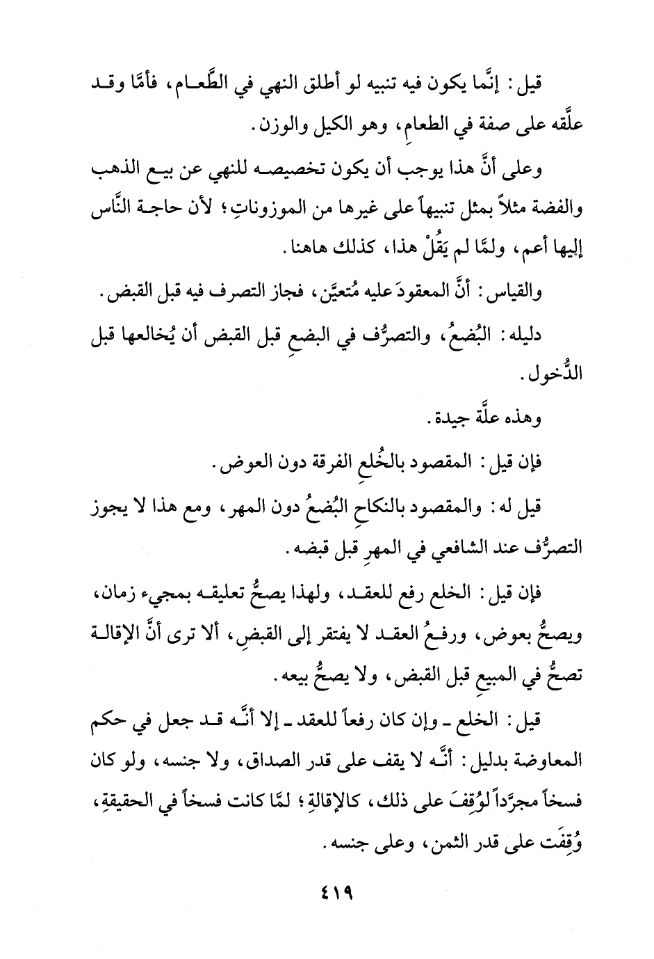 قيل: الخلع- وإن كان رفعًا للعقد- إلا أنه قد جعل في حكم المعاوضة بدليل: أنه لا يقف على قدر الصداق, ولا جنسه, ولو كان فسخًا مجردًا لوقف على ذلك, كالإقالة؛ لما كانت فسخًا في الحقيقة, وقفت على قدر الثمن, وعلى جنسه.
