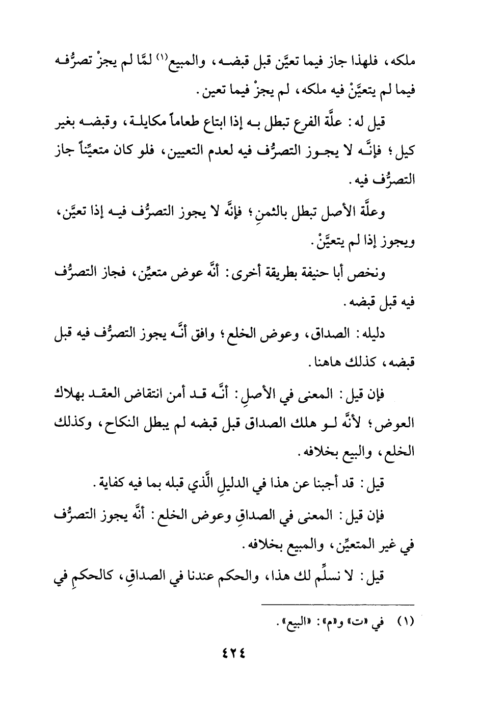 فإن قيل: المعنى في الصداق وعوض الخلع: أنه يجوز التصرف في غير المتعين, والمبيع بخلافه.