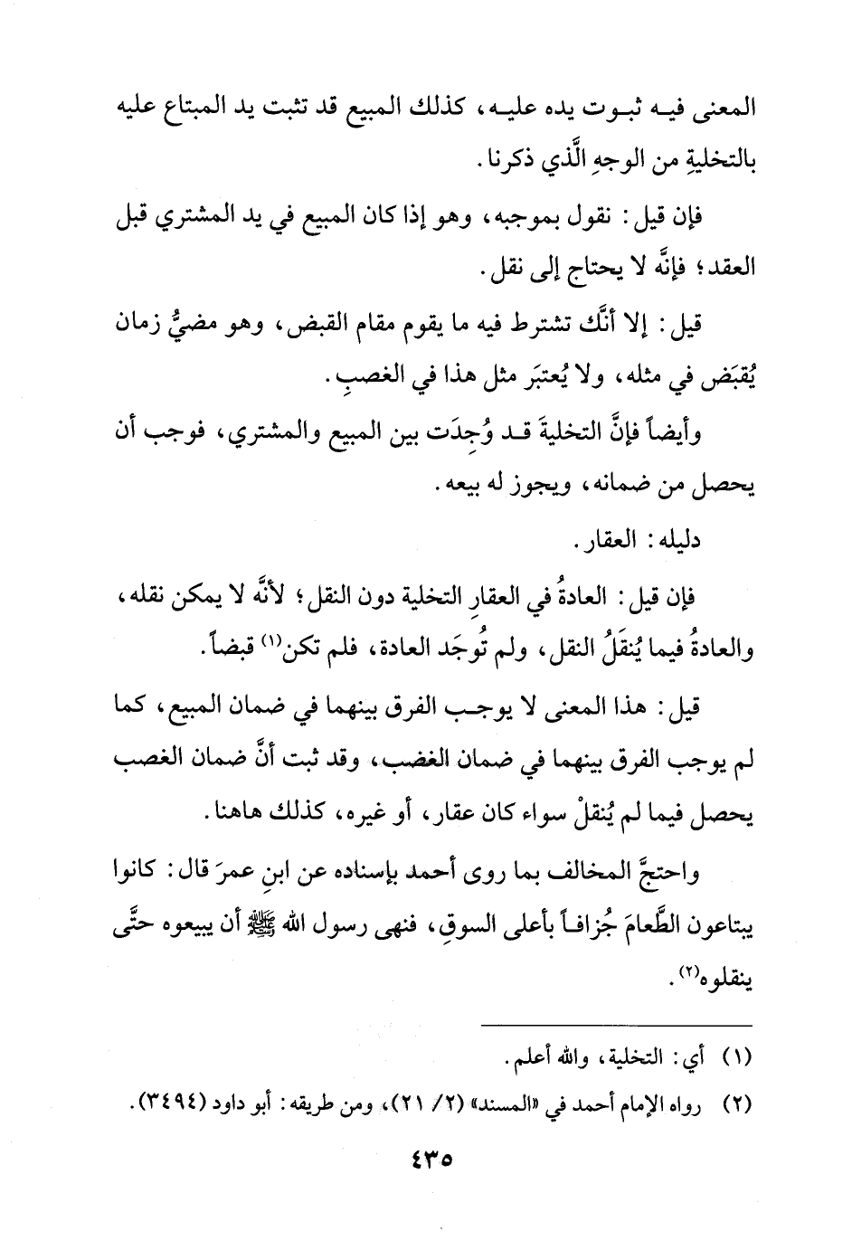 واحتج المخالف بما روى أحمد بإسناده عن ابن عمر قال: كانوا يبتاعون الطعام جزافًا بأعلى السوق, فنهى رسول الله - صلى الله عليه وسلم - أن يبيعوه حتى ينقلوه