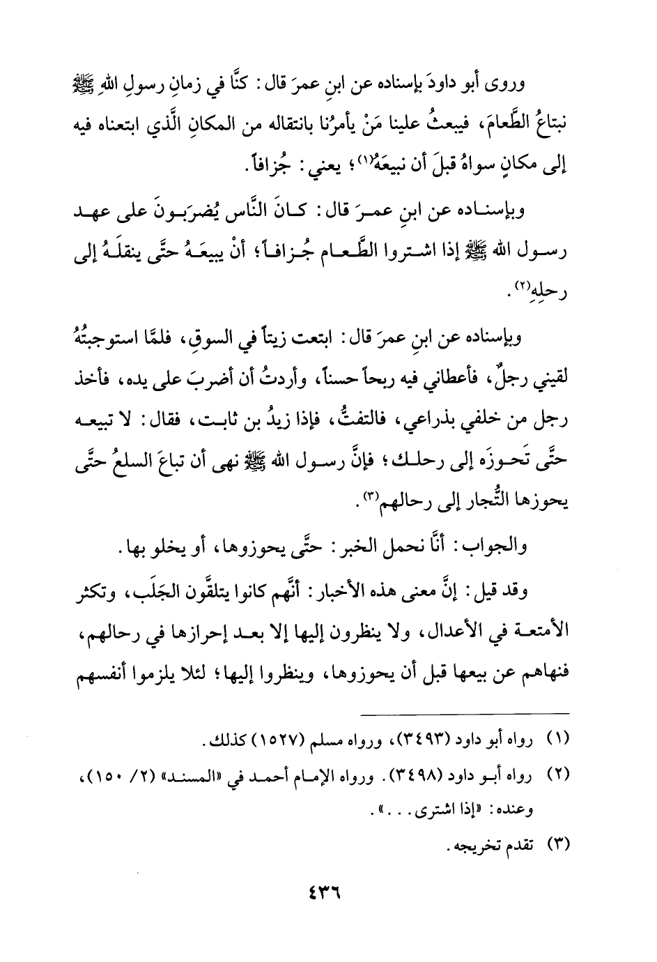 وبإسناده عن ابن عمر قال: ابتعت زيتًا في السوق, فلما استوجبته لقيني رجل, فأعطاني فيه ربحًا حسنًا, وأردت أن أضرب على يده, فأخذ رجل من خلفي بذراعي, فالتقت, فإذا زيد بن ثابت, فقال: لا تبيعه حتى تحوزه إلى رحلك؛ فإن رسول الله - صلى الله عليه وسلم - نهى أن تباع السلع حتى يحوزها التجار إلى رحالهم.