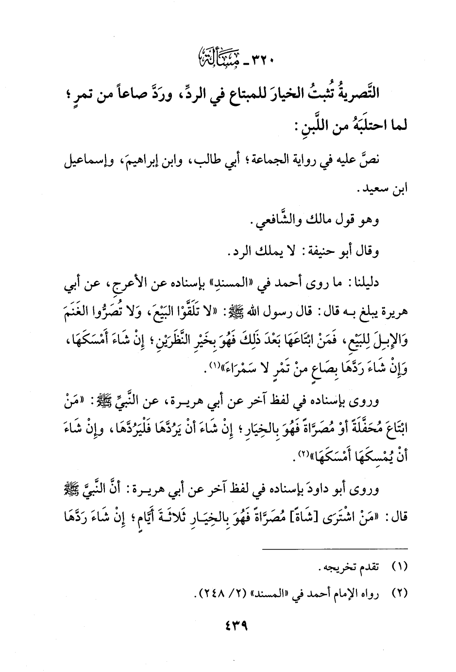 دليلنا: ما روى أحمد في (المسند) بإسناده عن الأعرج, عن أبي هريرة يبلغ به قال: قال رسول الله - صلى الله عليه وسلم -: (لا تلقوا البيع, ولا تصروا الغنم والإبل للبيع, فمن ابتاعها بعد ذلك فهو بخير النظرين؛ إن شاء أمسكها, وإن شاء ردها بصاع من تمر لا سمراء).
