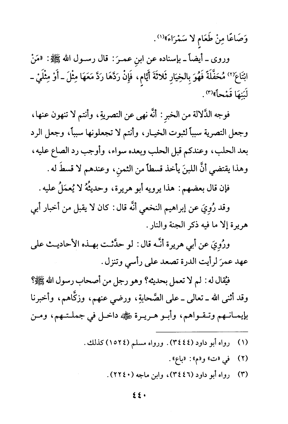 وروى- أيضًا- بإسناده عن ابن عمر: قال رسول الله - صلى الله عليه وسلم -: (من ابتاع محفلة فهو بالخيار ثلاثة أيامٍ, فإن ردها رد معها مثل- أو مثلي- لبنها قمحًا).
