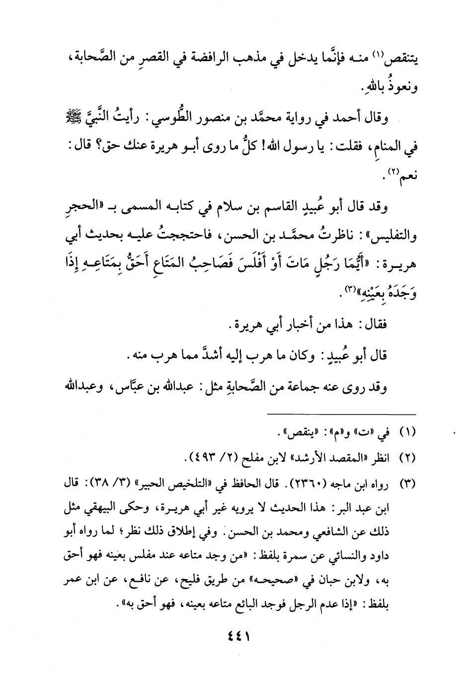 وقد قال أبو عبيدٍ القاسم بن سلام في كتابه المسمى بـ (الحجر والتفليس): ناظرت محمد بن الحسن, فاحتججت عليه بحديث أبي هريرة: (ايما رجلٍ مات أو أفلس فصاحب المتاع أحق بمتاعه إذا وجده بعينه).