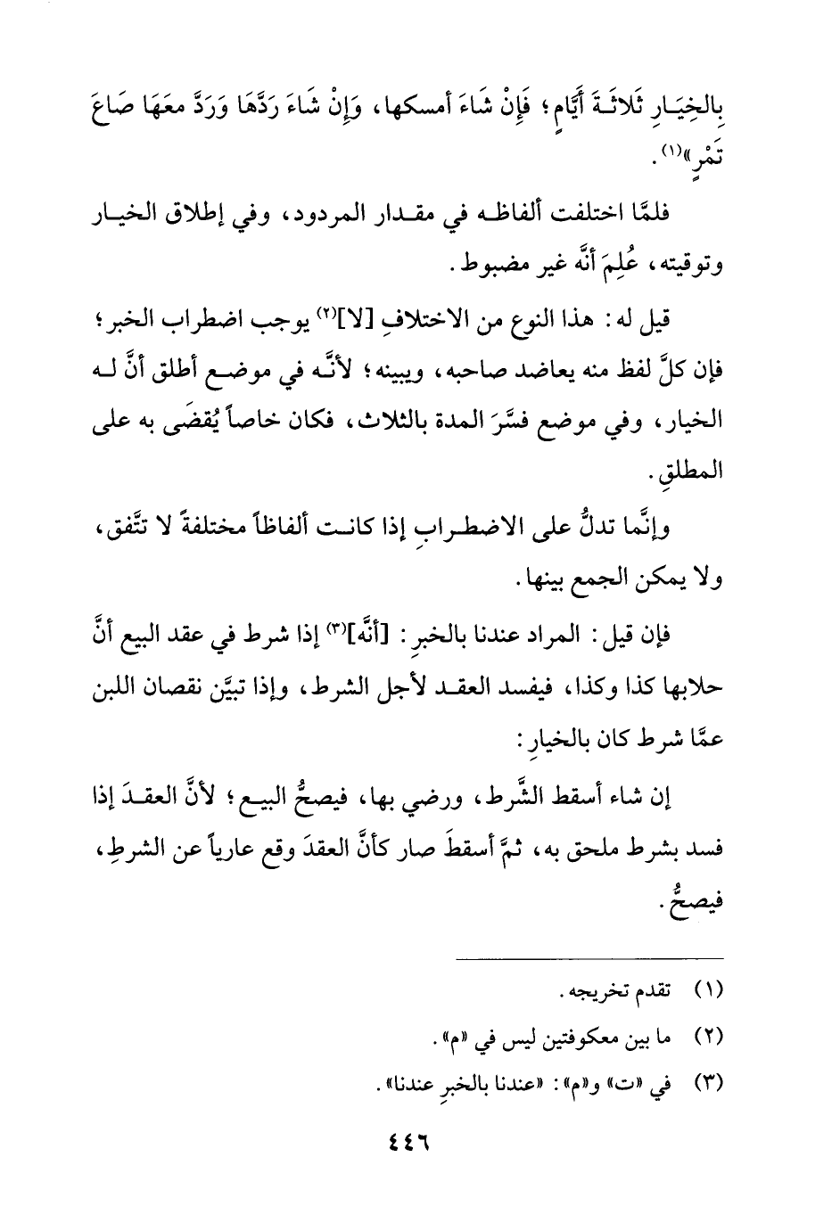 فلما اختلفت ألفاظه في مقدار المردود, وفي إطلاق الخيار وتوقيته, علم أنه غير مضبوط.