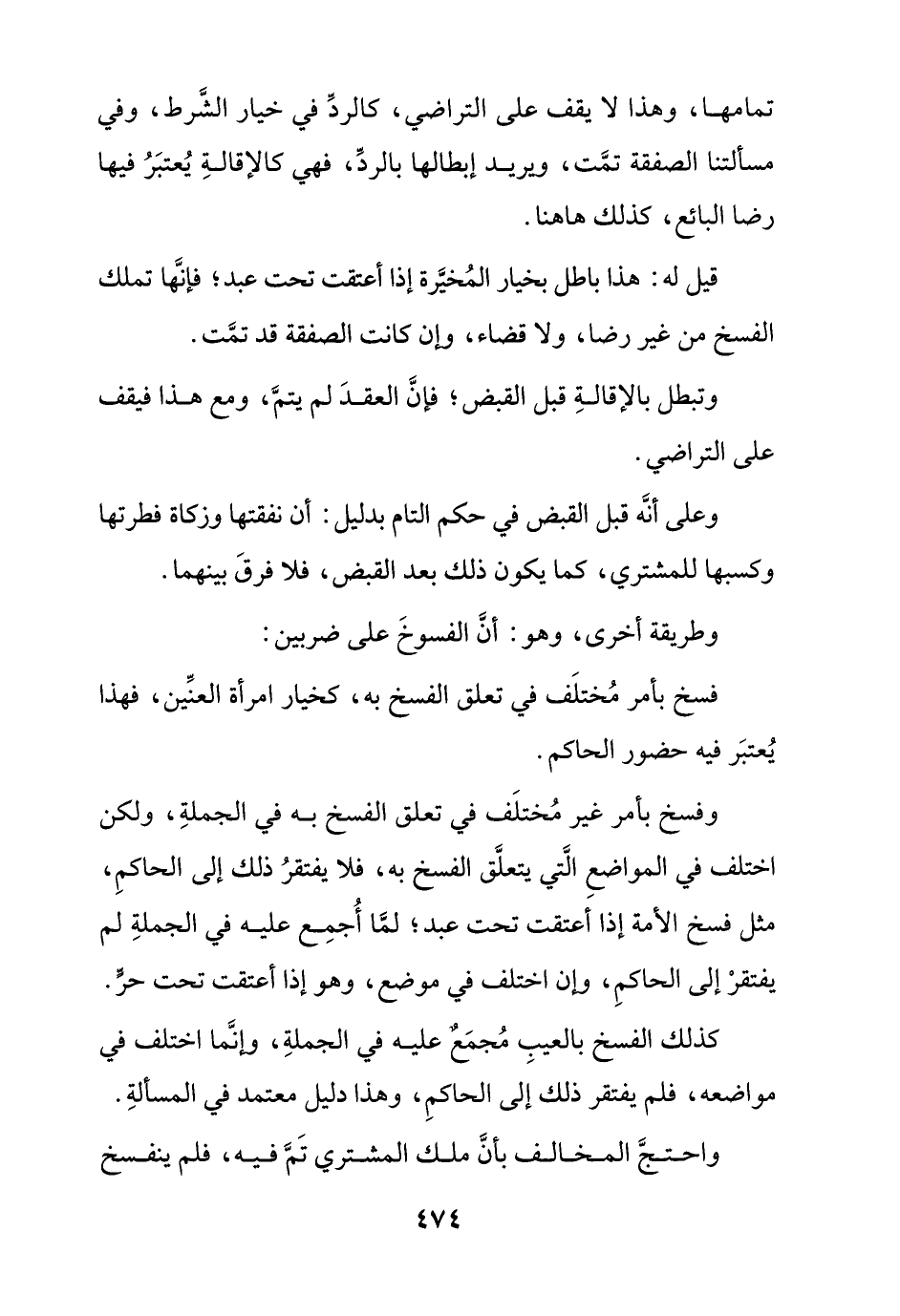 قيل له: هذا باطل بخيار المخيرة إذا أعتقت تحت عبد؛ فإنها تملك الفسخ من غير رضا, ولا قضاء, وإن كانت الصفقة قد تمت.