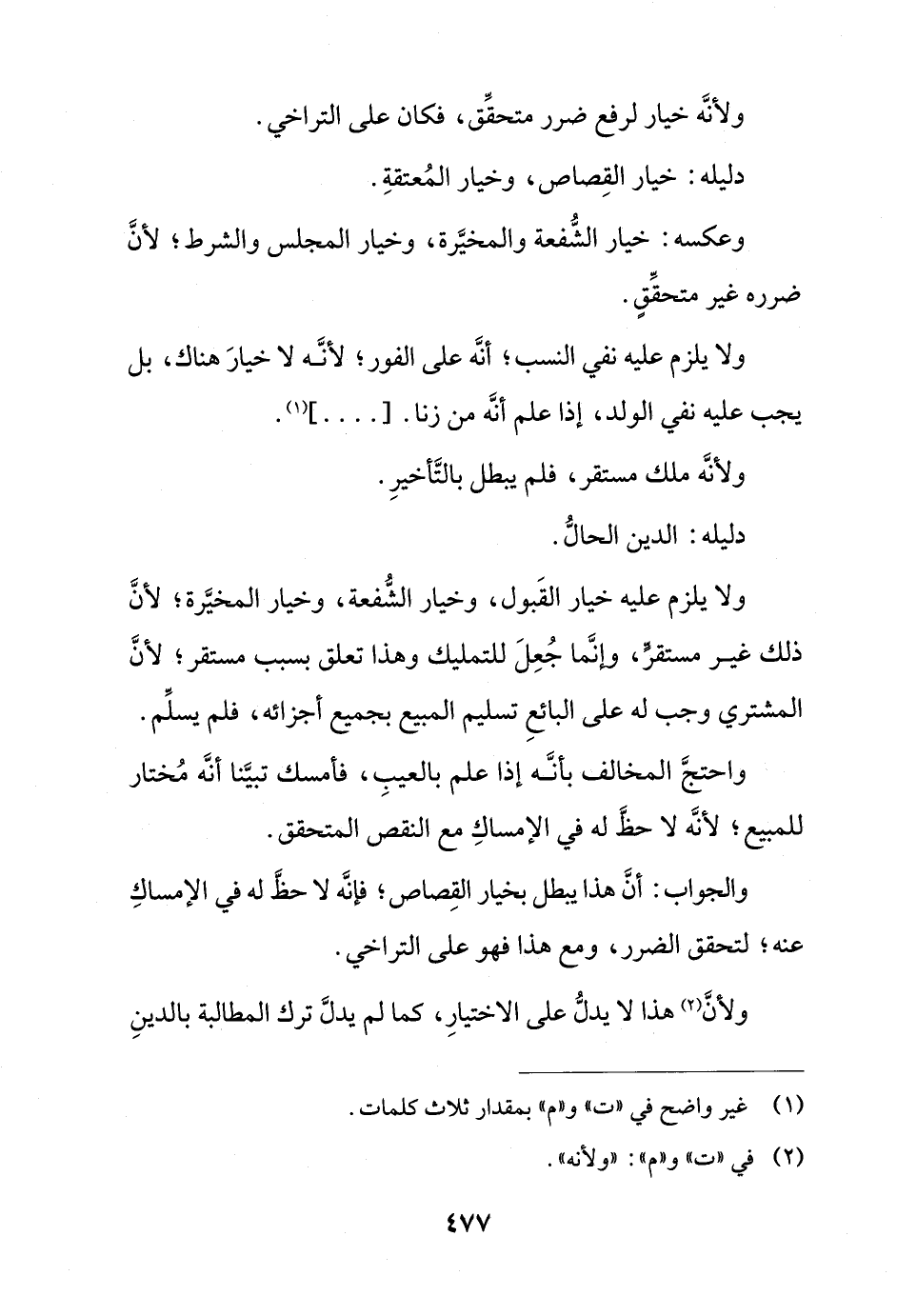 ولا يلزم عليه خيار القبول، وخيار الشفعة، وخيار المخيرة؛ لأن ذلك غير مستقر، وإنما جعل للتمليك وهذا تعلق بسبب مستقر؛ لأن المشتري وجب له على الائع تسليم المبيع بجميع أجزائه، فلم يسلم.