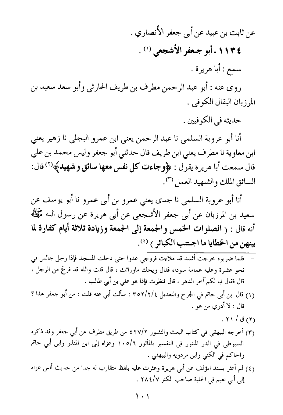 أَخْبَرنا أبو عَرُوبَة السلمي ، حَدَّثنا عبد الرحمن ، يَعنِي ابن عَمْرو البجلي ، حَدَّثنا زهير ، يَعنِي ابن معاوية ، حَدَّثنا مطرف ، يَعنِي ابن طريف ، قال : حَدَّثني أبو جعفر وليس محمد بن علي ، قال : سَمِعتُ أبا هريرة يقول ( وجاءت كل نفس معها سائق وشهيد ) قال : السائق الملك والشهيد العمل.