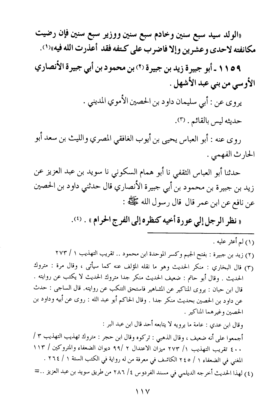 حدثنا أبو العباس الثقفي ، حَدَّثنا أبو همام السكوني ، حَدَّثنا سويد بن عبد العزيز عن زيد بن جبيرة بن محمود بن أبي جبيرة الأنصاري ، قال : حَدَّثني داود بن الحصين عن نافع عن ابن عُمَر ، قال : قال رسول الله صلى الله عليه وسلم : نظر الرجل إلى عورة أخيه كنظره إلى الفرج الحرام.