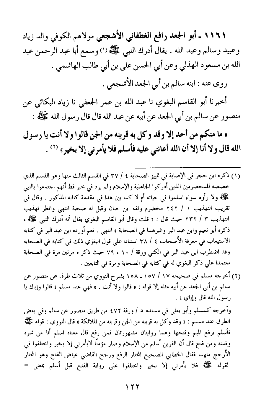 أخبرنا أبو القاسم البغوي ، حَدَّثنا عبد الله بن عُمَر الجعفي ، حَدَّثنا زياد البكائي عن منصور عن سالم بن أبي الجعد ، عَن أبيه عن عبد الله ، قال : قال رسول الله صلى الله عليه وسلم : ما منكم من أحد إلا وقد وكل به قرينه من الجن قالوا ولا أنت يارسول الله قال ولا أنا إلا أعانني عليه فأسلم فلا يأمرني إلا بخير.