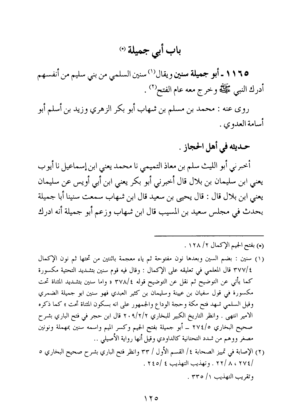 أخبرنا أبو الليث سلم بن معاذ التميمي ، حَدَّثنا محمد ، يَعنِي ابن إسماعيل ، حَدَّثنا أيوب ، يَعنِي ابن سُليمان بن بلال قال أخبرني أبو بكر ، يَعنِي ابن أبي أويس عن سُليمان ، يَعنِي ابن بلال قال : قال يحيى بن سعيد قال ابن شهاب سمعت سنينا أبا جميلة يحدث في مجلس سعيد بن المُسَيَّب قال ابن شهاب وزعم أبو جميلة أنه أدرك النبي صلى الله عليه وسلم وخرج معه عام الفتح.