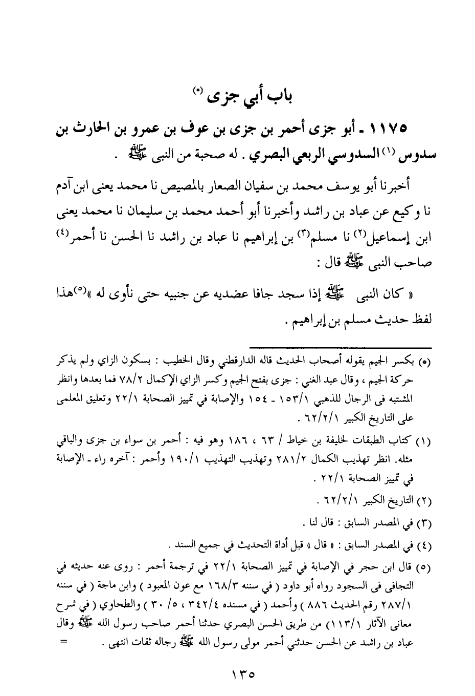 أخبرنا أبو يوسف محمد بن سفيان الصعار بالمصيص ، حَدَّثنا محمد ، يَعنِي ابن آدم ، حَدَّثنا وكيع عن عباد بن راشد وأخبرنا أبو أحمد محمد بن سُليمان ، حَدَّثنا محمد ، يَعنِي ابن إسماعيل ، حَدَّثنا مسلم بن إبراهيم ، حَدَّثنا عباد بن راشد ، حَدَّثنا الحسن ، حَدَّثنا أحمر صاحب النبي صلى الله عليه وسلم قال : كان النبي صلى الله عليه وسلم إذا سجد جافا عضديه عن جنبيه حتى نأوى له هذا لفظ حديث مسلم بن إبراهيم.