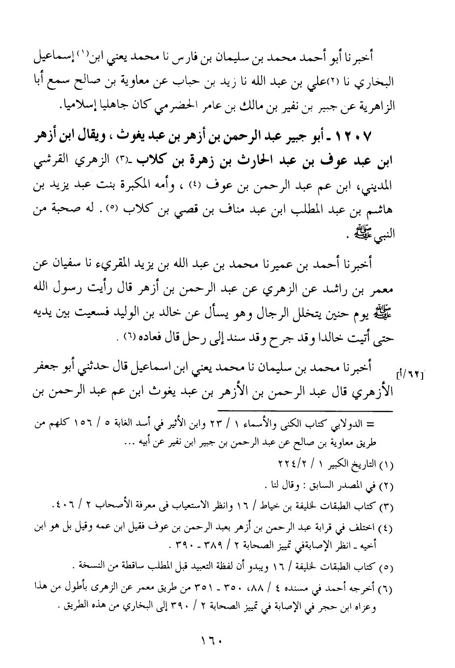 1207- أبو جبير عبد الرحمن بن أزهر بن عبد يغوث ، وَيُقَال : ابن أزهر بن عبد عوف بن عبد الحارث بن زهرة بن كلاب الزهري القرشي المديني ابن عم عبد الرحمن بن عوف وأمه المكبرة بنت عبد يزيد بن هاشم بن عبد المطلب ابن عبد مناف بن قصي بن كلاب.