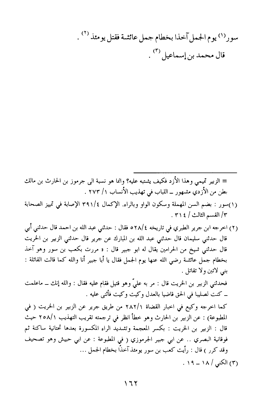 1209- أبو جبيرة الجرمموزي قال رأيت كعب بن سور يوم الجمل آخذا بخطام جمل عائشة فقتل يومئذ.