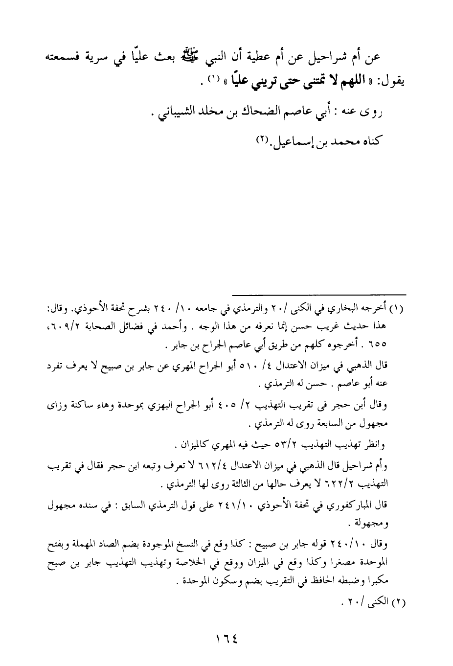 عن أم شراحيل عن أم عطية أن النبي صلى الله عليه وسلم بعث عليا في سرية فسمعته يقول : اللهم لا تمتني حتى تريني عليا.
