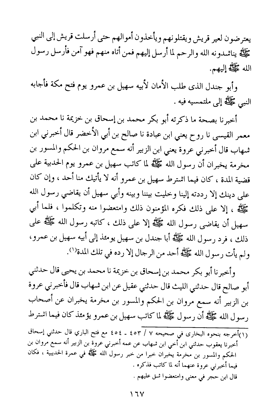 وأخبرنا أبو بكر محمد بن إسحاق بن خزيمة ، حَدَّثنا محمد بن يحيى ، قال : حَدَّثني أبو صالح ، قال : حَدَّثني الليث ، قال : حَدَّثني عقيل عن ابن شهاب قال فأخبرني عروة بن الزبير أنه سمع مروان بن الحكم والمسور بن مخرمة يخبران عن أصحاب رسول الله صلى الله عليه وسلم أن رسول الله صلى الله عليه وسلم لما كاتب سهيل بن عَمْرو يومئذ كان فيما اشترط سهيل بن عَمْرو على رسول الله صلى الله عليه وسلم