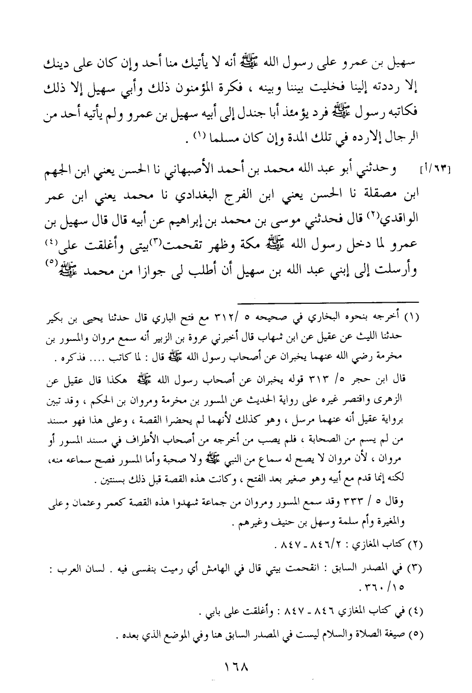 وحدثني أبو عبد الله محمد بن أحمد الأصبهاني ، حَدَّثنا الحسن ، يَعنِي ابن الجهم بن مصقلة ، حَدَّثنا الحسن ، يَعنِي ابن الفرج البغدادي ، حَدَّثنا محمد ، يَعنِي ابن عُمَر الواقدي قال فحدثني موسى بن محمد بن إبراهيم ، عَن أبيه ، قال : قال سهيل بن عَمْرو لما دخل رسول الله صلى الله عليه وسلم مكة وظهر تقحمت بيتي وأغلقت على وأرسلت إلى ابني عبد الله بن سهيل أن أطلب لي جوازا من محمد صلى الله عليه وسلم فإني لا آمن أن أقتل قال وجعلت أتذكر أثرى عند محمد صلى الله عليه وسلم وأصحابه فليس أحد أسوأ أثرا مني وأني لقيت رسول الله صلى الله عليه وسلم يوم الحديبية بما لم يلقه أحد وكنت الذي كاتبته مع حضوري بدرا واحدا وكلما تحركت قريش كنت فيها فذهب عبد الله بن سهيل إلى رسول الله صلى الله عليه وسلم
