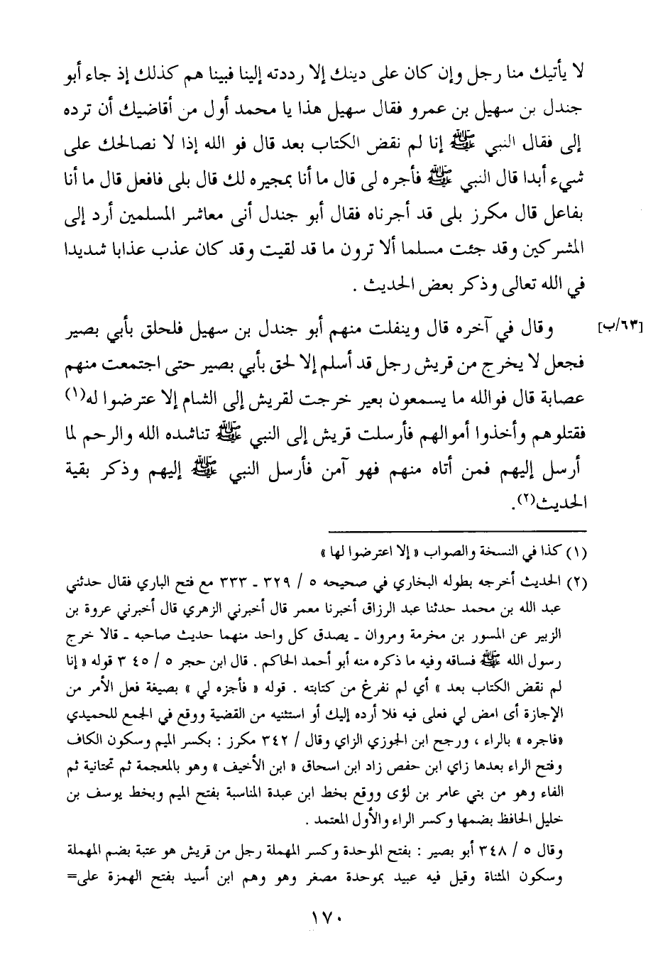فبينا هم كذلك إذا جاء أبو جندل بن سهيل بن عَمْرو فقال سهيل هذا يا محمد أول من أقاضيك أن ترده إلى فقال النبي صلى الله عليه وسلم إنا لم نقض الكتاب بعد قال فوالله إذا لا نصالحك على شيء أبدا قال النبي صلى الله عليه وسلم فأجره لي قال ما أنا بمجيره لك قال بلى فافعل قال ما أنا بفاعل قال مكرز بلى قد أجرناه فقال أبو جندل أنى معاشر المسلمين أرد إلى المشركين وقد جئت مسلما ألا ترون ما قد لقيت وقد كان عذب عذابا شديدا في الله تعالى وذكر بعض الحديث.