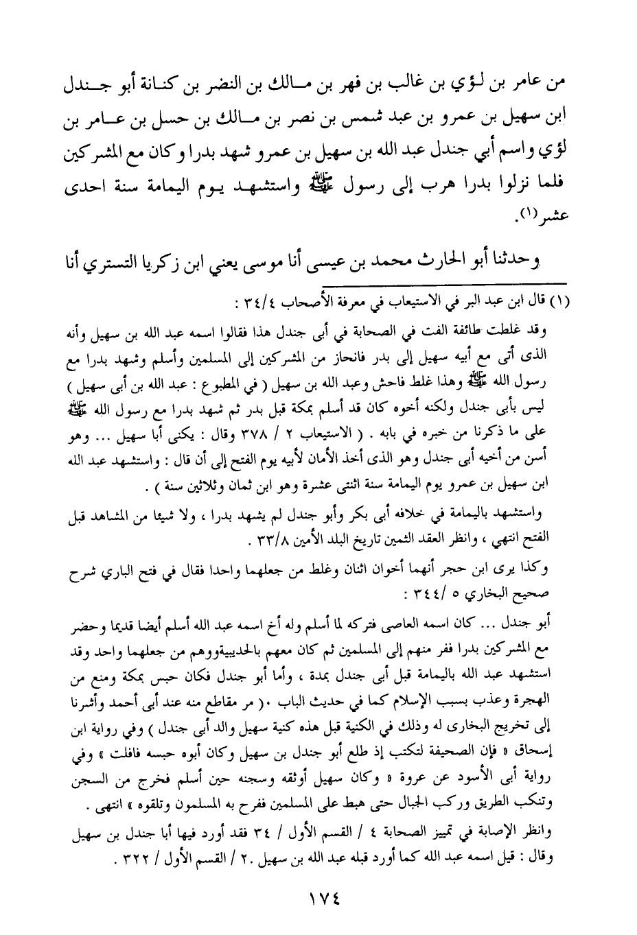 حدثنا أبو الحارث محمد بن عيسى الجوزجاني ، أَخْبَرنا موسى ، يَعنِي ابن زكريا التستري ، أَخْبَرنا خليفة ، يَعنِي ابن خياط قال في تسمية أصحاب رسول الله صلى الله عليه وسلم من عامر بن لؤي بن غالب بن فهر بن مالك بن النضر بن كنانة أبو جندل بن سهيل بن عَمْرو بن عبد شمس بن نصر بن مالك بن حسل بن عامر بن لؤي ، وَاسْمُ أبي جندل عبد الله بن سهيل بن عَمْرو شهد بدرا ، وكان مع المشركين فلما نزلوا بدرا هرب إلى رسول الله صلى الله عليه وسلم واستشهد يوم اليمامة سنة احدى عشر.