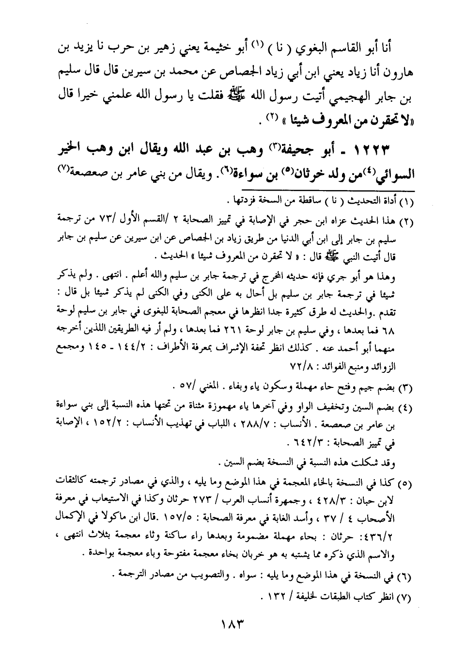 أَخْبَرنا أبو القاسم البغوي ، حَدَّثنا أبو خيثمة ، يَعني زهير بن حرب ، حَدَّثنا يزيد بن هارون ، أَخْبَرنا زياد ، يَعنِي ابن أبي زياد الجصاص عن محمد بن سيرين ، قال : قال سليم بن جابر الهجيمي أتيت رسول الله صلى الله عليه وسلم فقلت يارسول الله علمني خيرا قال لا تحقرن من المعروف شيئًا.