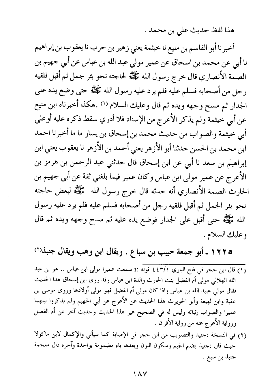 هكذا أخبرناه ابن منيع عن أبي خيثمة ولم يذكر الأعرج من الأسناد فلا أدري سقط ذكره عليه أو على أبي خيثمة والصواب من حديث محمد بن إسحاق بن يسار ما أخبرنا أحمد بن محمد بن الحسن حدثنا أبو الأزهر ، يَعني أحمد بن الأزهر ، حَدَّثنا يعقوب ، يَعنِي ابن إبراهيم بن سعد ، حَدَّثنا أبي عن ابن إسحاق ، قال : حَدَّثني عبد الرحمن بن هرمز الأعرج عن عُمَير مولى ابن عباس ، وكان عُمَير فيما بلغني ثقة عن أبي جهيم بن الحارث الصمة الأنصاري أنه حدثه قال خرج رسول الله صلى الله عليه وسلم لبعض حاجته نحو بئر الجمل ثم أقبل فلقيه رجل من أصحابه فسلم عليه فلم يرد عليه رسول الله صلى الله عليه وسلم حتى أقبل على الجدار فوضع يده عليه ثم مسح وجهه ويده ثم قال وعليك السلام.