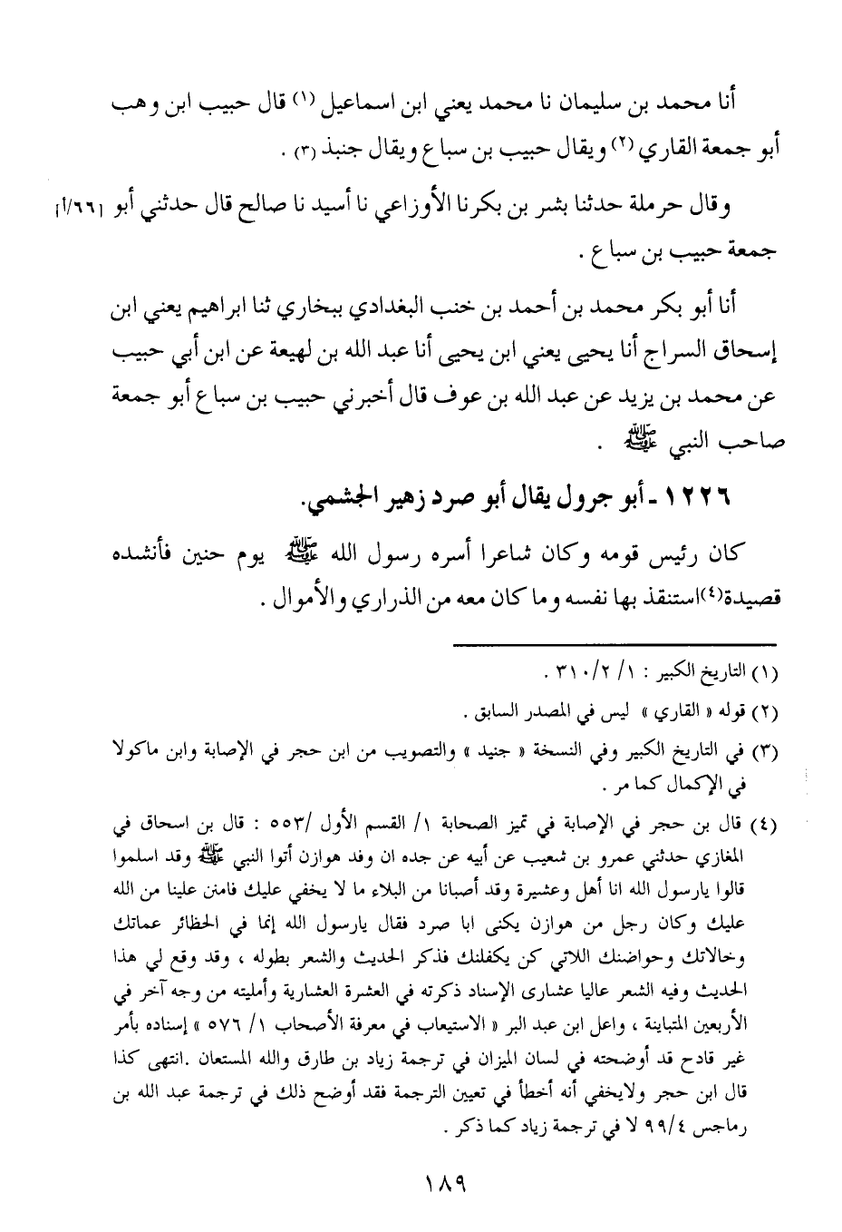 أَخْبَرنا أبو بكر محمد بن أحمد بن خنب البغدادي ببخارى ثنا إبراهيم ، يَعنِي ابن إسحاق السراج ، أَخْبَرنا يحيى ، يَعنِي ابن يحيى ، أَخْبَرنا عبد الله بن لهيعة عن ابن أبي حبيب عن محمد بن يزيد عن عبد الله بن عوف قال أخبرني حبيب بن سباع أبو جمعة صاحب النبي صلى الله عليه وسلم.