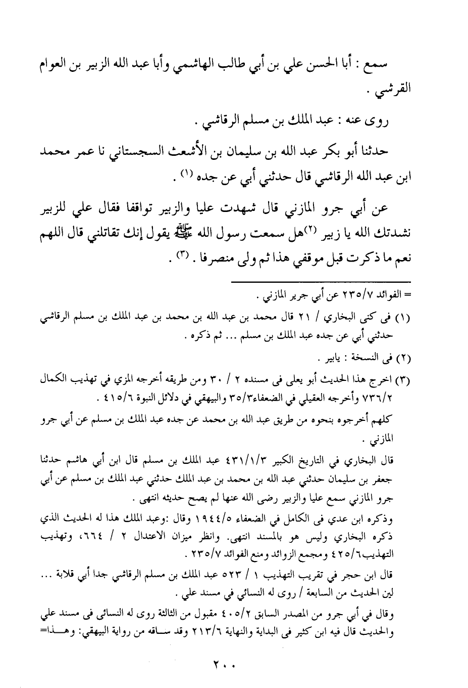 عن أبي جرو المازني قال شهدت عليا والزبير توافقا فقال على للزبير نشدتك الله يازبير هل سمعت رسول الله صلى الله عليه وسلم يقول إنك تقاتلني قال اللهم نعم ما ذكرت قبل موقفي هذا ثم ولى منصرفا.