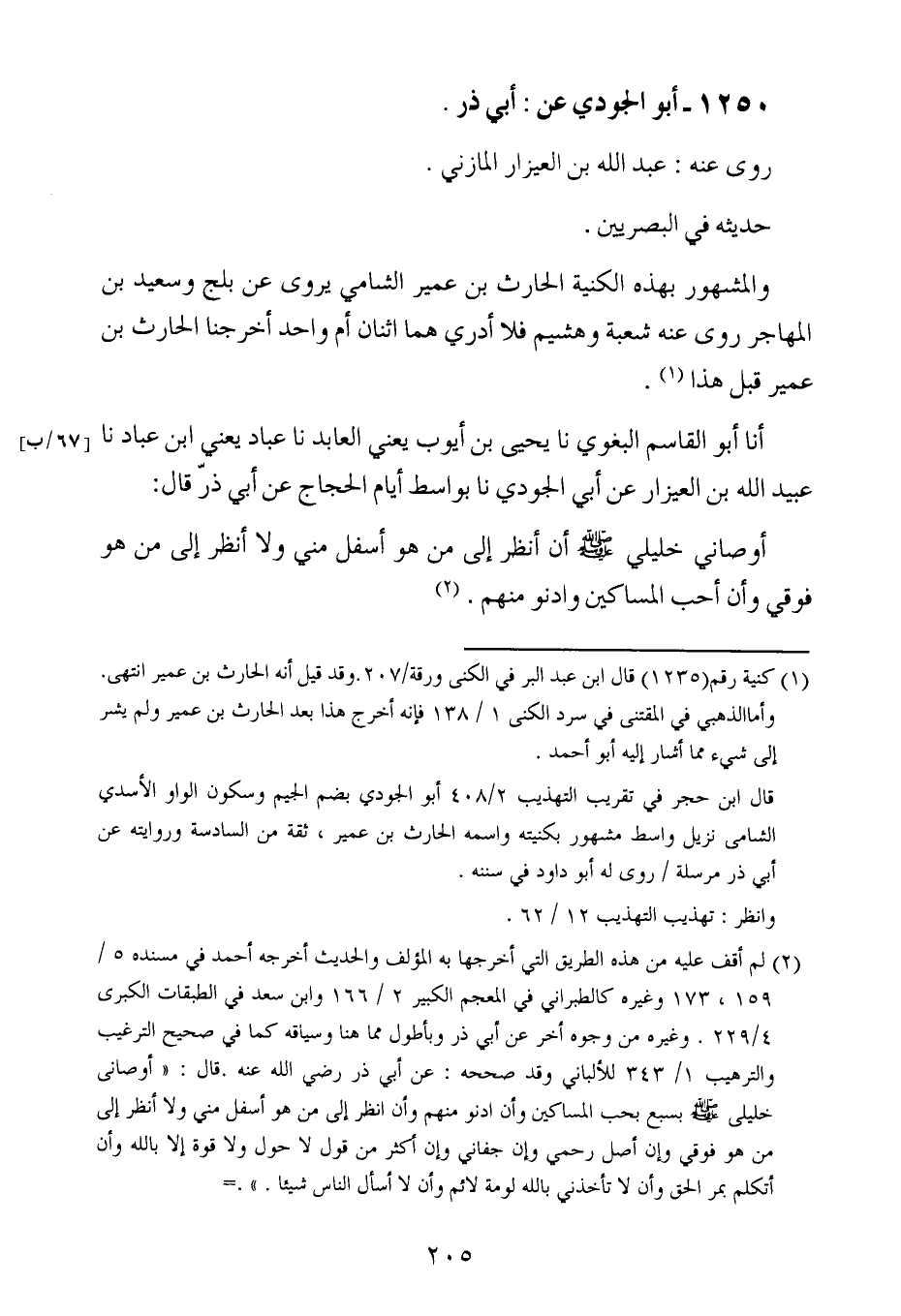 ، حَدَّثنا أبو القاسم البغوي ، حَدَّثنا يحيى بن أيوب ، يَعني العابد ، حَدَّثنا عباد ، يَعنِي ابن عباد ، حَدَّثنا عبيد الله بن العيزار عن أبي الجودي ، حَدَّثنا بواسط أيام الحجاج عن أبي ذر قال : أوصاني خليلي صلى الله عليه وسلم أن أنظر إلى من هو أسفل مني ولا أنظر إلى من هو فوقي وأن أحب المساكين وادنو منهم.