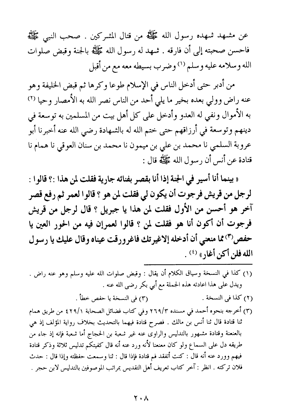 أخبرنا أبو عَرُوبَة السلمي ، حَدَّثنا محمد بن علي بن ميمون ، حَدَّثنا محمد بن سنان العوقي ، حَدَّثنا همام ، حَدَّثنا قتادة ، عَن أَنس أن رسول الله صلى الله عليه وسلم قال : بينما أنا أسير في الجنة إذا أنا بقصر بفنائة جارية فقلت لمن هذا ؟ قالوا : لرجل من قريش فرجوت أن يكون لي فقلت لمن هو ؟ قالوا لعمر ثم رفع قصر آخر هو أحسن من الأول فقلت لمن هذا ياجبريل ؟ قال لرجل من قريش فرجوت أن أكون أنا هو فقلت لمن ؟ قالوا لعمر إن فيه من الحور العين ياحفص مما منعني أن أدخله إلا غيرتك فاغرورقت عيناه وقال عليك يارسول الله فلن أكن أغار.