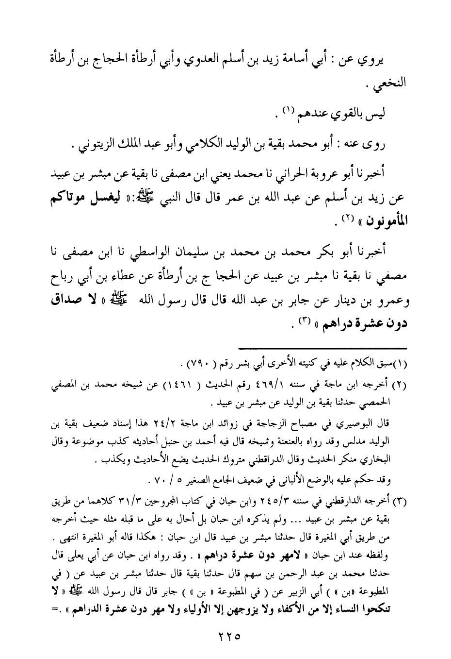 أخبرنا أبو عَرُوبَة الحراني ، حَدَّثنا محمد ، يَعنِي ابن مصفى ، حَدَّثنا بقية عن مبشر بن عبيد عن زيد بن أسلم عن عبد الله بن عُمَر ، قال : قال النبي صلى الله عليه وسلم : ليغسل موتاكم المأمونون.