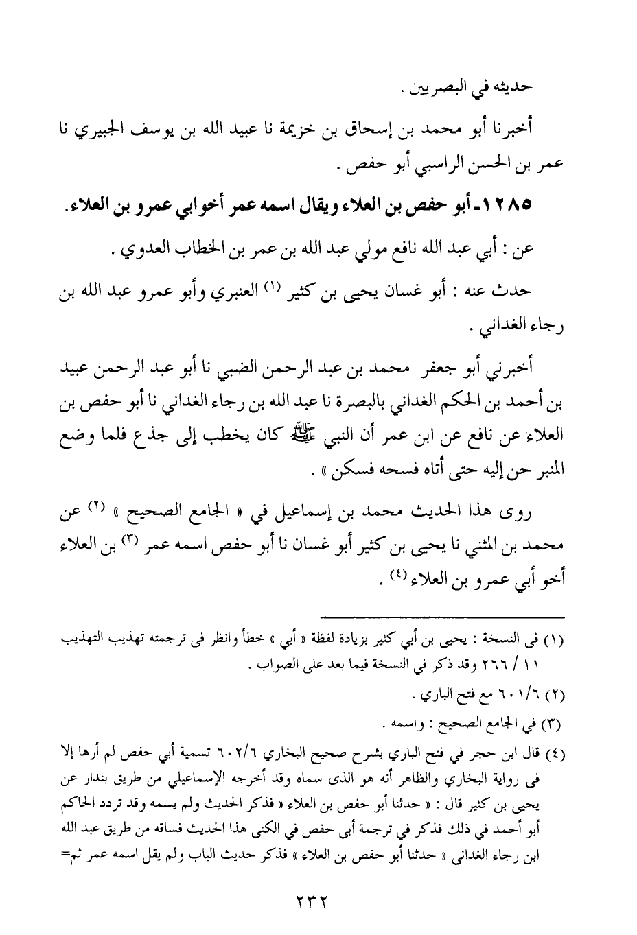 اخبرني أبو جعفر محمد بن عبد الرحمن الضبي ، حَدَّثنا أبو عبد الرحمن عبيد بن أحمد بن الحكم الغداني بالبصرة ، حَدَّثنا عبد الله بن رجاء الغداني ، حَدَّثنا أبو حفص بن العلاء عن نافع عن ابن عُمَر أن النبي صلى الله عليه وسلم كان يخطب إلى جذع فلما وضع المنبر حن إليه حتى أتاه فسحه فسكن.
