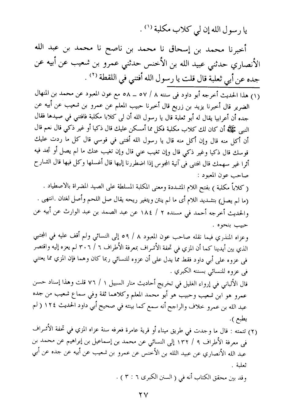 أخبرنا محمد بن سُليمان ، حَدَّثنا محمد ، يَعنِي ابن إسماعيل ، حَدَّثنا المقدمي ، حَدَّثنا معتمر ، قال : سَمِعتُ ليثا عن عَمْرو بن شعيب ، عَن أبيه عن عبد الله بن عَمْرو عن النبي صلى الله عليه وسلم فقام إليه عَمْرو بن جرثوم في قصة أهل الكتاب.