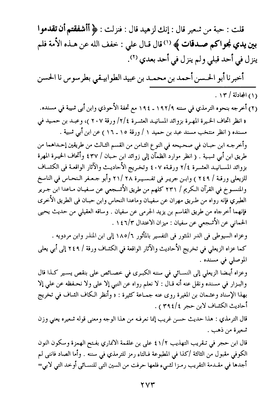 قلت : حبة من شعير قال : إنك لزهيد قال فنزلت ( أأشفقتم ان تقدموا بين يدي نجواكم صدقات ) ، قال : قال علي خفف الله عن هذه الأمة فلم ينزل في أحد قبلي ولم ينزل في أحد بعدي.
