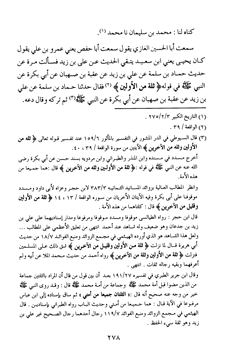 سمعت أبا الحسين الغازي يقول : سَمِعتُ أبا حفص ، يَعني عَمْرو بن علي يقول كان يحيى ، يَعنِي ابن سعيد يتقي الحديث عن علي بن زيد فسألت مرة عن حديث حماد بن سلمة عن علي بن زيد عن عقبة بن صهبان عن أبي بكرة عن النبي صلى الله عليه وسلم في قوله ( ثلة من الولين ) فقال حدثنا حماد بن سلمة عن علي بن زيد عن عقبة بن صهبان عن أبي بكرة عن النبي صلى الله عليه وسلم ثم تركه وقال دعه.