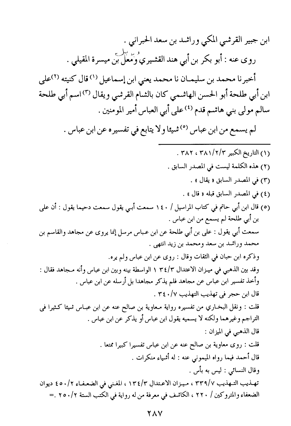 وأخبرنا أحمد بن محمد بن الحسن ، قال : سَمِعتُ عليا بن سعيد النسوي يقول وسمعته ، يَعني أحمد بن حنبل يقول علي بن أبي طلحة الذي يروي تفسيرا عن ابن عباس وعلي بن أبي طلحة هو الذي يروي عن راشد بن سعد عن المقدام عن النبي صلى الله عليه وسلم من ترك كلا.