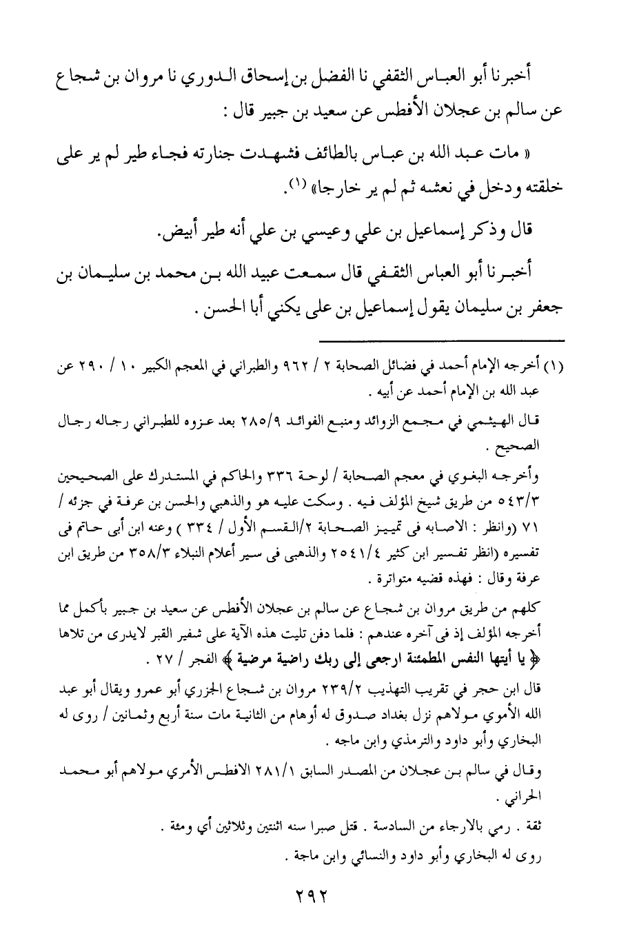 أخبرنا أبو العباس الثقفي ، حَدَّثنا الفضل بن إسحاق الدوري ، حَدَّثنا مروان بن شجاع عن سالم بن عجلان الأفطس عن سعيد بن جبير قال : مات عبد الله بن عباس بالطائف فشهدت جنازته فجاء طير لم ير على خلقته ودخل في نعشه ثم لم ير خارجا.