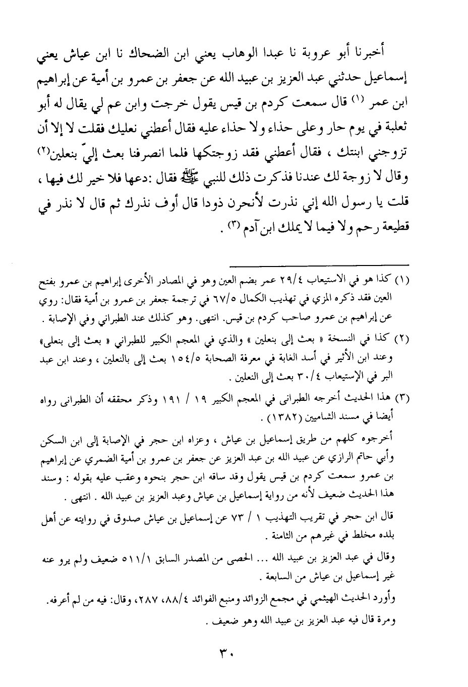 أخبرنا أبو عَرُوبَة ، حَدَّثنا عبدا الوهاب ، يَعنِي ابن الضحاك ، حَدَّثنا ابن عباس ، يَعني إسماعيل حدثني عبد العزيز بن عبيد الله عن جعفر بن عَمْرو بن أمية عن إبراهيم بن عُمَر ، قال : سَمِعتُ كردم بن قيس يقول خرجت وابن عم لي ، يُقَال له : أبُو ثعلبة في يوم حار وعلى حذاء ولا حذاء عليه فقال أعطني نعليك فقلت لا إلا أن تزوجني ابنتك فقال أعطني فقد زوجتكها فلما انصرفنا بعث إلي بنعلين وقال لا زوجة لك عندنا فذكرت ذلك للنبي صلى الله عليه وسلم فقال : دعها فلا خير لك فيها قلت يارسول الله إني نذرت لأنحرن ذودا قال أوف نذرك ثم قال لا نذر في قطيعة رحم ولا فيما لا يملك ابن آدم.