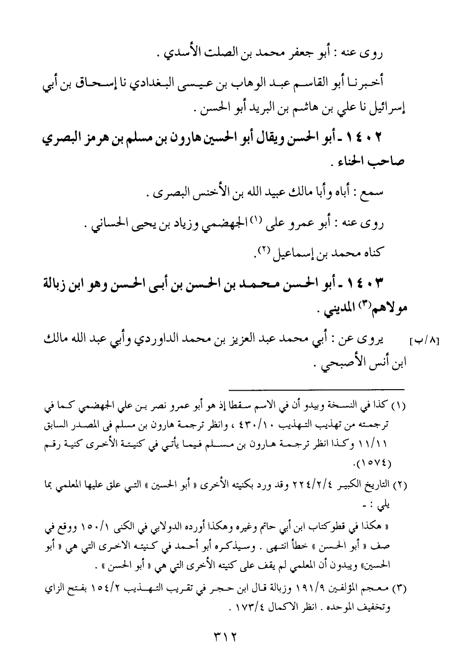 1402- أبو الحسن ، وَيُقَال : أبو الحسين هارون بن مسلم بن هرمز البصري صاحب الحناء.