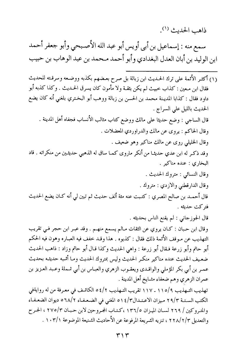 أخبرني أبو جعفر محمد بن عبد الرحمن الضبي قال قرأت على رشدين ، يَعني أحمد بن محمد بن الحجاج ، قال : سَمِعتُ أحمد ، يَعنِي ابن صالح يقول ما رأيت أحدا قط أعلم بالمغازي ولا نساب من ابن زبالة ورأيت فيه ثلاث خصال رأيت فيه رؤيا قال ابن رشدين فحدثني بعض أصحابنا عن أحمد أنه رأى كأنه يضع يده في دم خنزير أو نفسه قال أحمد بن صالح رأيته أخذ أشياء لابن إسحاق من المغازي لا يرويها في الدنيا إلا ابن إسحاق فوصلها بإسانيد فجاء بها على الوجه لا واحد ولا اثنين ولا عشرا ولا عشرين ، وكان ابن أبي أويس ينهاني عنه ، وكان يأتيه فأنكر قلبي ذاك وقلت تنهاني عنه ويأتيه.